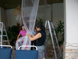 I came in from Neili on Wednesday night, as soon as the grading and meetings were done. Thursday we went to the American Club to "bag" and tie all the plants were could find in burlap. We had to make another trip to the fabric market to pick up another 15 yards of burlap and 50 yards of mosquito netting. We were allowed into the pool area on Friday at 2 PM to finish up. Di, Malaina, and I developed the entrance as best we could under C's guidance. You will see both before and after pictures. And it turned out quite nicely!